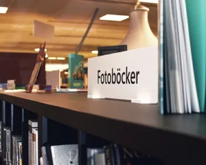 Hyllskylt med fotställ, Nässjö Bibliotek